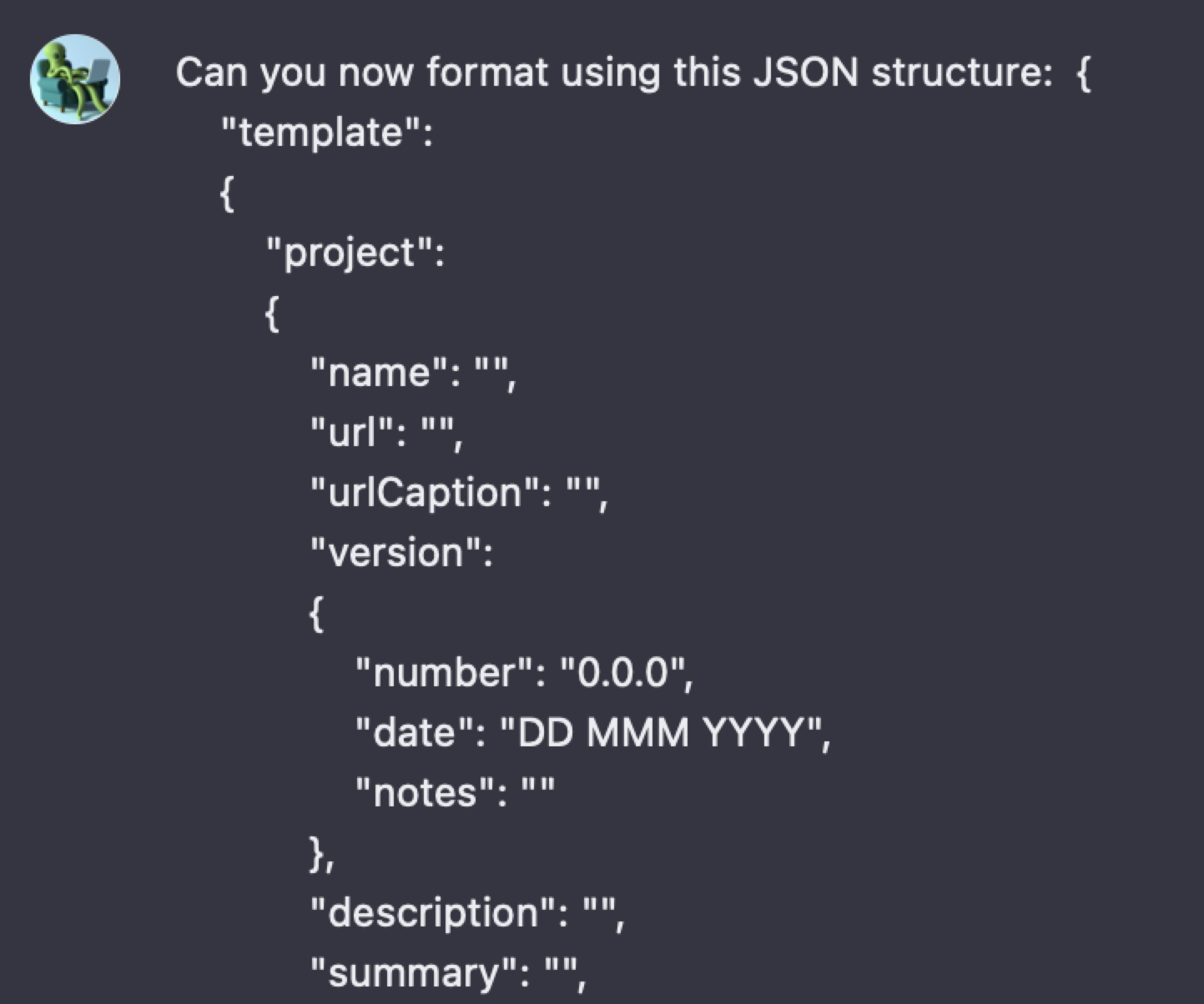 CA Prompt #2: "Can you now format using this JSON structure: { ... the selfdriven Template Format ... }